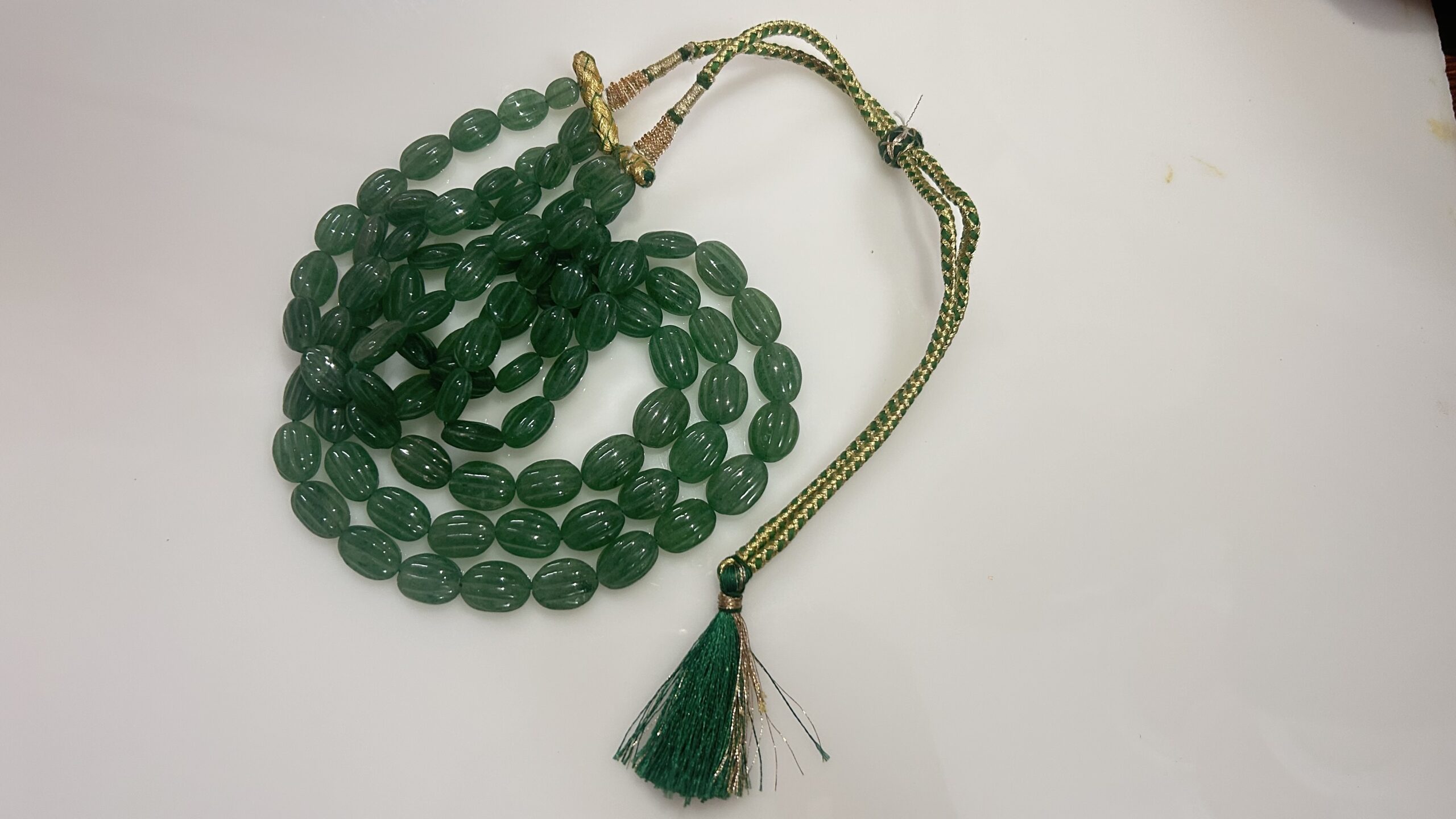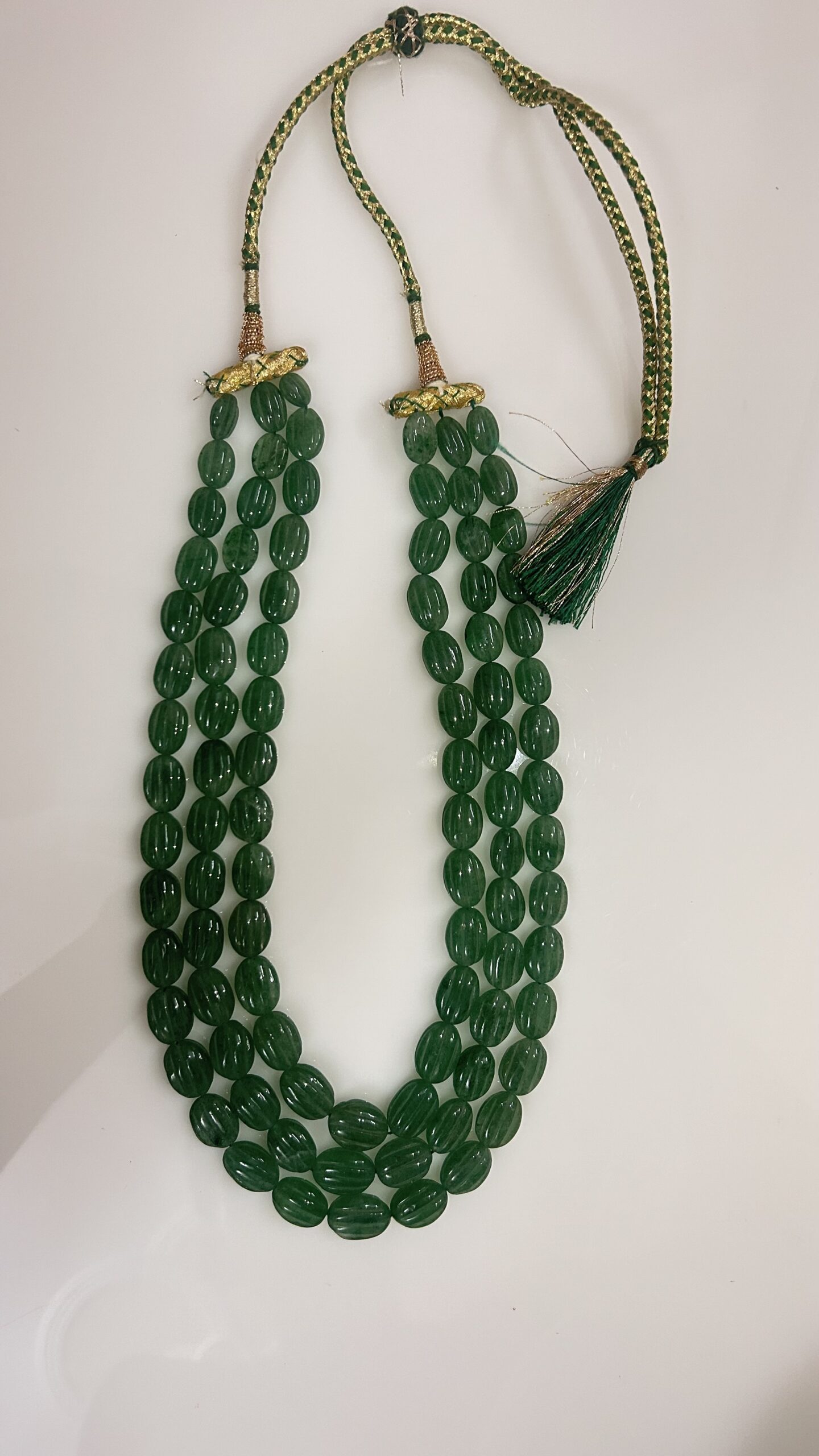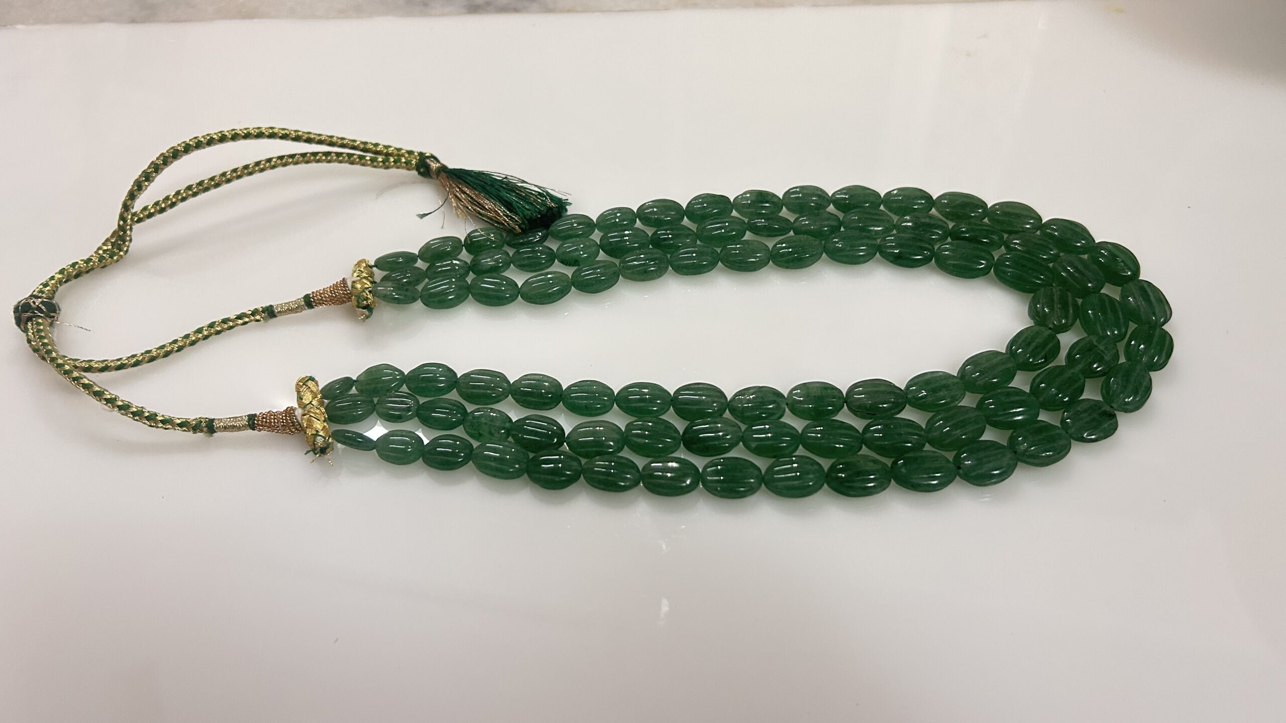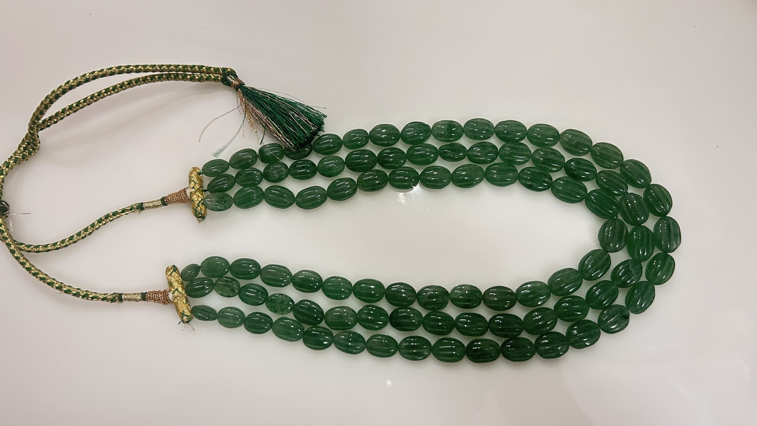 The oval-shaped beads, meticulously carved with fine vertical ridges, are strung in three uniform layers to create a bold yet graceful silhouette. The piece is finished with a handcrafted silk thread drawstring in traditional green and gold, offering both comfort and adjustability.